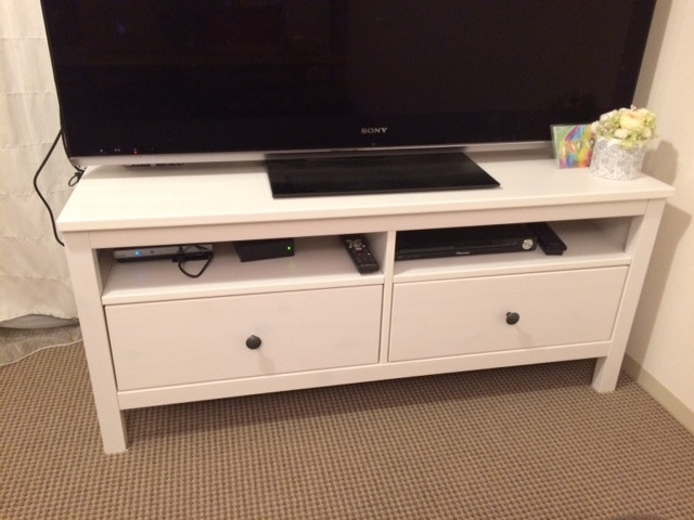 テレビ台もIKEA. これは逆にTVの大きさに合わせないといけませんでした。 台が小さくて飛び出た角に当たって「痛い!」となりたくなかったので・・・。