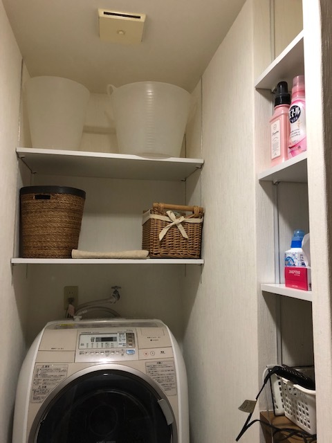 はじめに引っ越してきたときは、 どうやってこの脱衣洗面室を使おうかと 一瞬悩みました。 だから、ここに置くのは最低限のものにしました。 そしてはじめは、棚もなかったんですよ! だから、しばらく生活してみて、 「棚があったほうがいい」結論に達して、 オーダーして付けてもらいました。