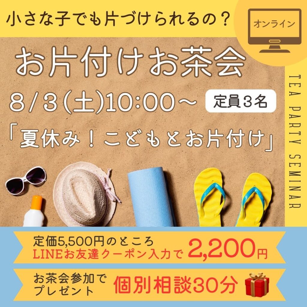 8月のお片付けお茶会は 「夏休み!こどもとお片付け」 というテーマでお話します。