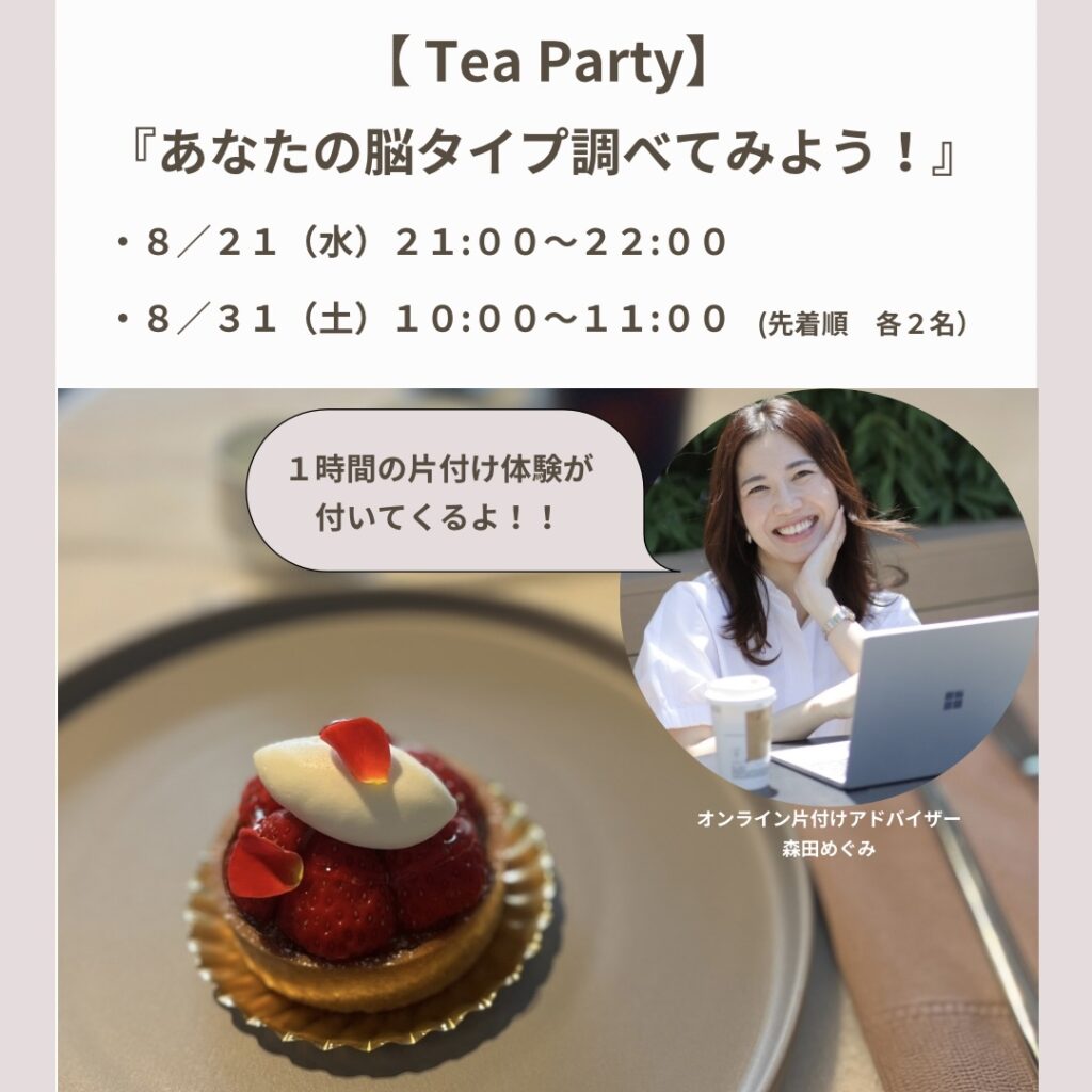 Teaparty『あなたの脳タイプを調べてみよう』定員2名 ー森田 めぐみー 自分の『脳タイプ』 を知って片付けのヒントを得よう!! 【開催日時】・8月21日(水) 21:00〜・8月31日(土) 10:00〜 公式LINEに登録してお申込み♪ ↓ ↓ ↓ https://lin.ee/xv90bdO