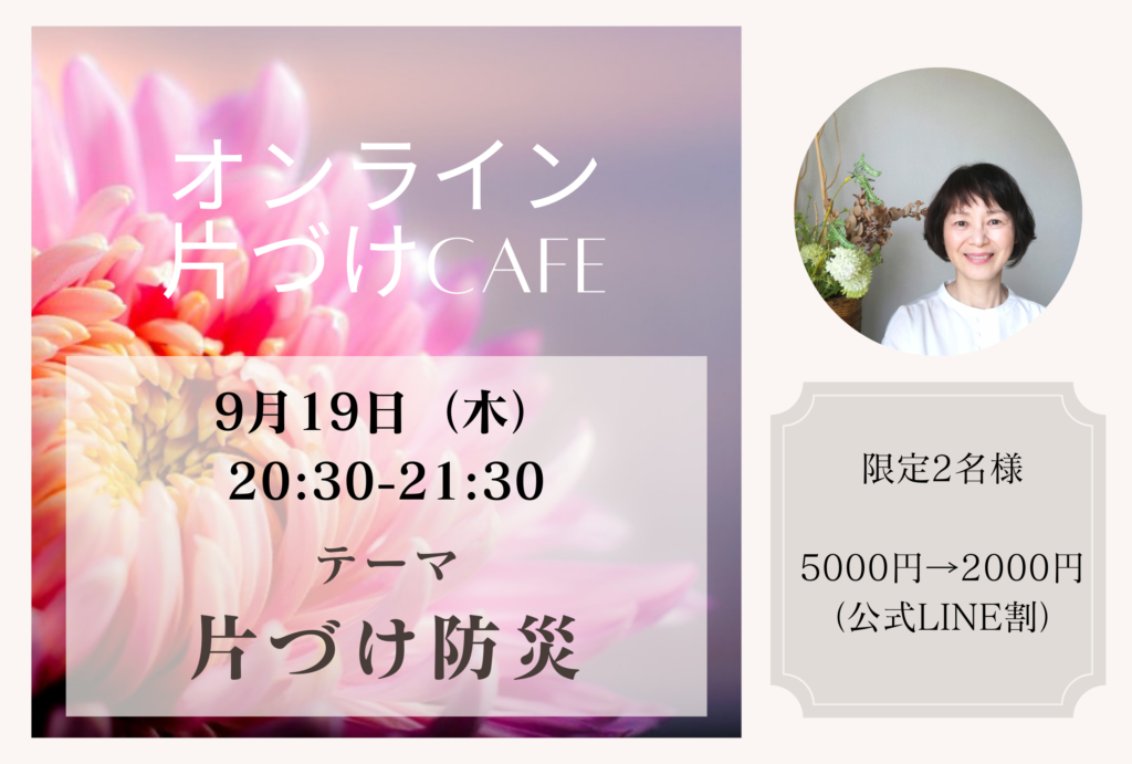 オンライン片づけ防災カフェ ーわきや さゆりー 防災、何をしていいか迷っているならぜひ! 今すぐできることをたくさんお話しします! ◇ 9月19日(火)20:30~21:30◇限定2名様 5,000円⇨2,000円(公式LINE割) お申し込みは公式lineご登録から!↓↓↓ https://lin.ee/Yjl1fN3