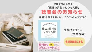 オンライン片付け専門家・伊藤かすみ先生の著書『魔法の片付けしつもん術』を使って、片付けの考え方をガラッと変える読書会を開催します!