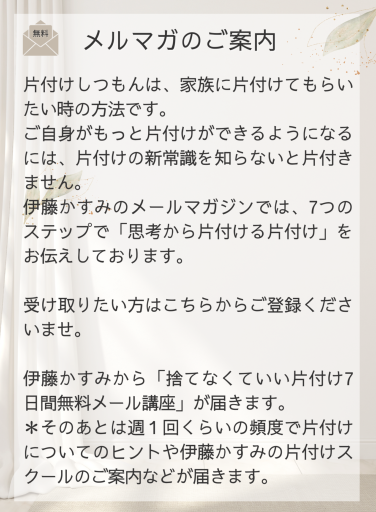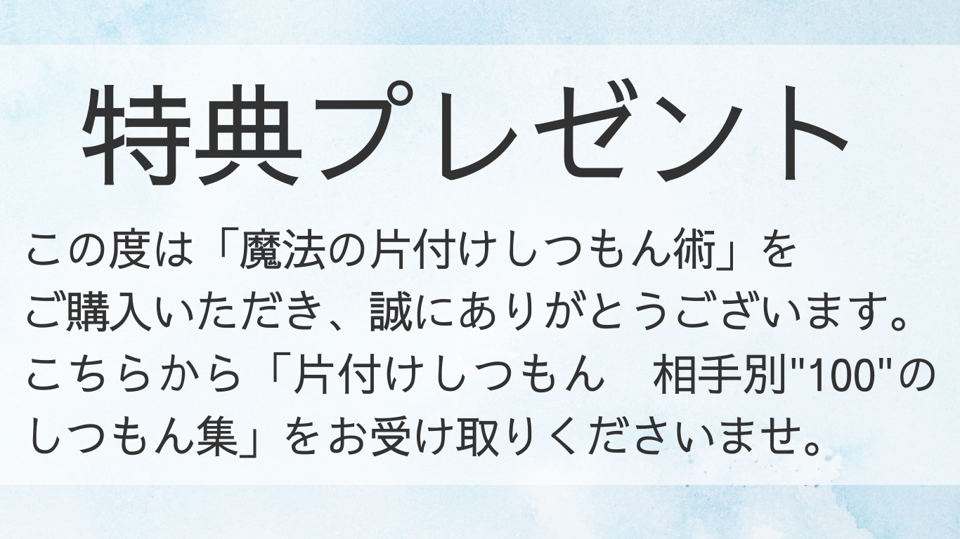 特典ページ 2024年11月7日 by support Facebook Instagram YouTube WordPress 伊藤かすみです。私の本「魔法の片付けしつもん術」はいかがでしたでしょうか?この本で、私はみなさんの片付けに関する家族のお悩みを解決したいと思ってこの本を書きました。ぜひ本に書いてあることを実践してみて家族と良い関係性を構築しながら片付けを進めてみてくださいませ。 特定商取引法に基づく表記|プライバシーポリシー